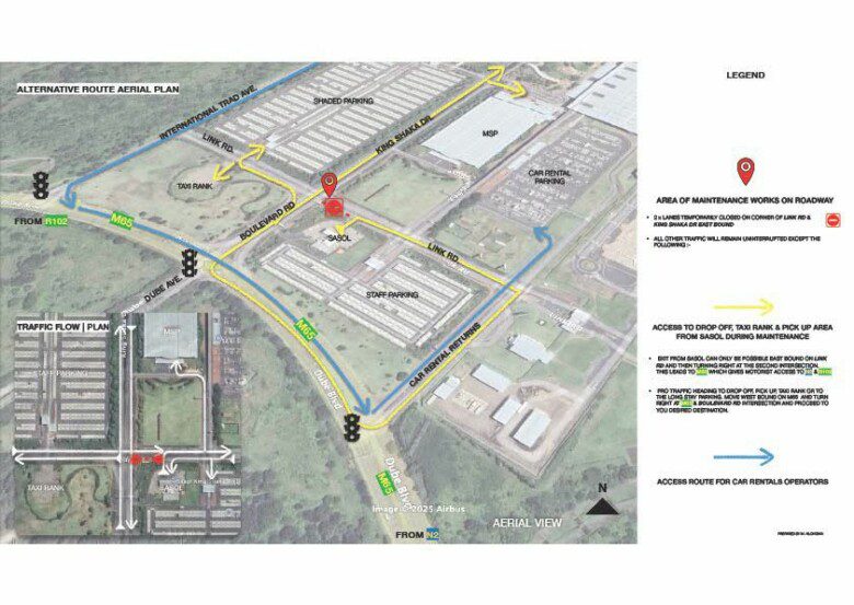 Please anticipate three (x3) lane closures on Link Road for Westbound traffic-area from Sasol entrance to King Shaka Drive and Link Road intersection due to urgent maintenance work.